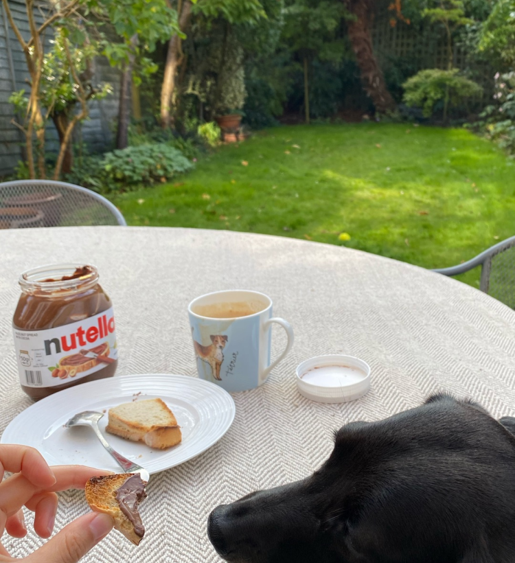 庭で朝ごはん食べながら。