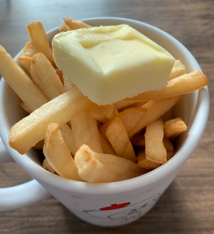 時間経つと、しわしわになりますよね😃いつも塩抜きで頼んでます。揚げたてなので幸せ。お!バター&醤油か😲❗最後は、さっぱり仕上げ(笑)美味しくなりそうですね