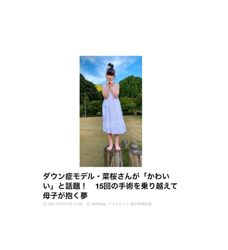 ダウン症モデル・菜桜さんが「かわいい」と話題! 15回の手術を乗り越えて母子が抱く夢 (AERAdot. アエラドット 朝日新聞出版) - LINE NEWS http://lin.ee/bIK2vOo?mediadetail=1&utm_source=line&utm_medium=share&utm_campaign=talk