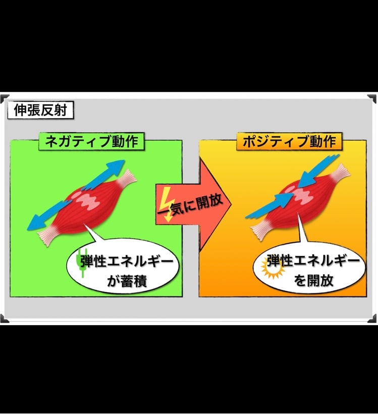◆筋肉が伸びる→縮むを勢いよくやることで伸張反射が使われる