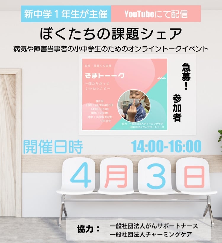 小児がんサバイバーの新中学1年生が、イベントを主催 病気や障害のよって起きるオンラインでの課題のシェア会「ぼくたちの課題シェア」そまトーークを4月3日に開催 イベントについてお話いただきました。 #小児がん #中学生 #サバイバー #イベント