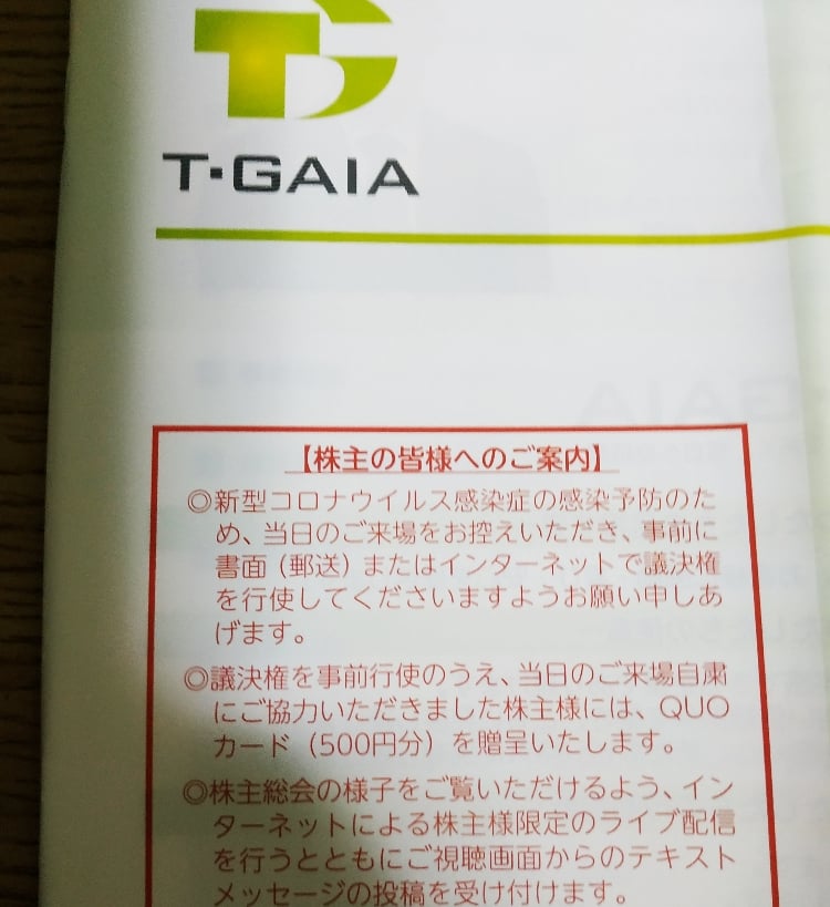 【隠れ優待】株式会社ティーガイアの株主総会を自粛するとクオカード500円分