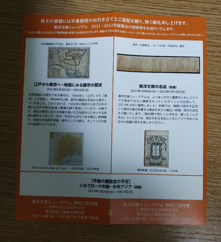 【1株優待】三菱総合研究所から東洋文庫ミュージアム招待券2名分が届きました