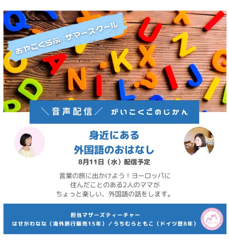 おやこくらぶサマースクール がいこくごのじかん 言葉の旅に出かけよう!ヨーロッパに住んだことのある2人のママが ちょっと楽しい、外国語の話をします。