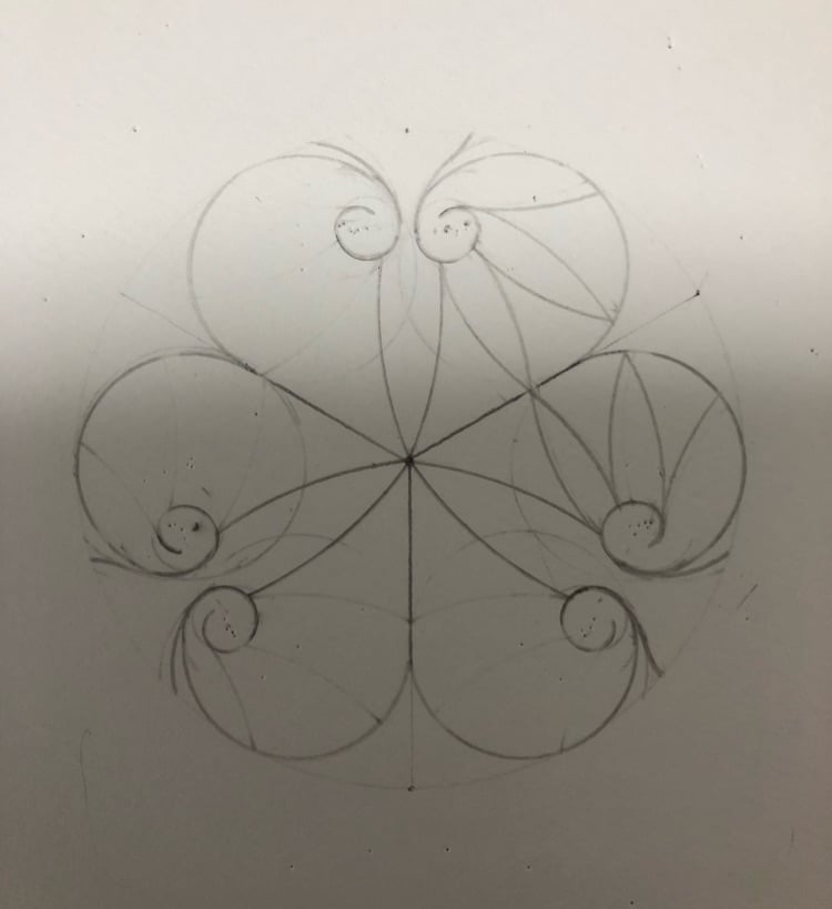 コンパスで紋を描いてます。 一つ前の手順に誤りがあって、円弧が上手く繋がらなかったので、やり直しています 誰でもできる コンパスと定規で描く「紋」 UWAEMON