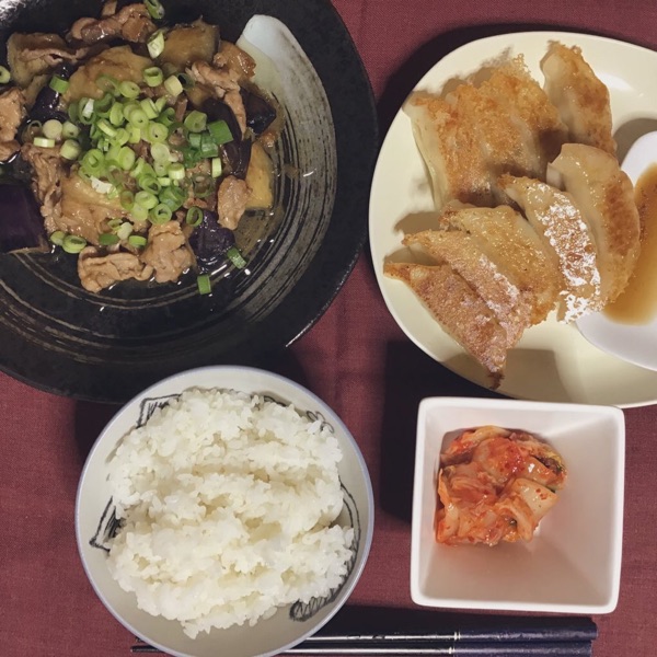 今日の晩ごはんは #豚茄子味噌炒め #焼き餃子 だよ