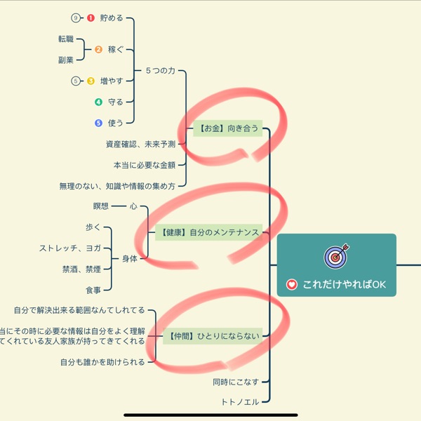 3つの柱とはお金、健康、仲間です。人生は複雑そうですが、ここを意識しておけばなんとかなりますし、幸福度も上がります。もしあなたが疲れていてもどれか一つ、なんとかなっていれば戻ってくることもできます。 人間は非力ですので、最後は頼れる仲間、家族かもしれませんね。あなたも誰かの力になっているはずです。 #自己肯定感 #幸福 #マインドマップ #マインドフルネス