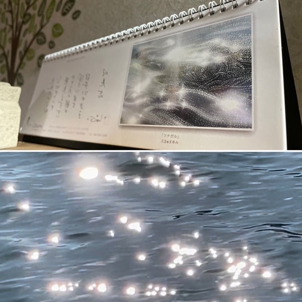 毎年、さゆちゃんが本質さんから伝えてもらう一年のメッセージ。佐木島のキラキラ輝く海を見ながら、2023年はどんな年になりそうなのか教えてもらいました。 写真は、佐木島の海と、 一ヶ月毎に本質さんからメッセージを受け取って作ってくれるさゆちゃんの2023年メッセージカレンダー。表紙は天念まゆみさんの音光波(おとは)アート。来年のイメージにピッタリ❣️