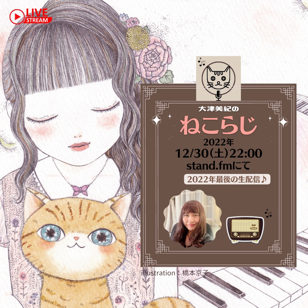 大津美紀のねこらじ 2022年12月30日(金)22時より 今年最後のねこらじ生配信になります。何かと慌ただしい時期ですが、是非、お気軽に遊びにいらしてくださいね。 いつもよりも遅めのスタートになります〜。