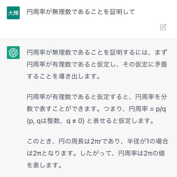 しかし、円の面積の公式により、円周率は正確に表現することはできません。したがって、円周率は有理数で表すことができないことになり、仮定に矛盾が生じます。