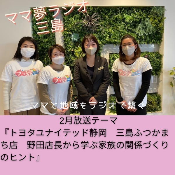 2月の放送アーカイブは、トヨタユナイテッド静岡 三島ふつかまち店にお邪魔して、野田店長さんより『家族関係づくりのヒント』というお話しを伺って来ました✨