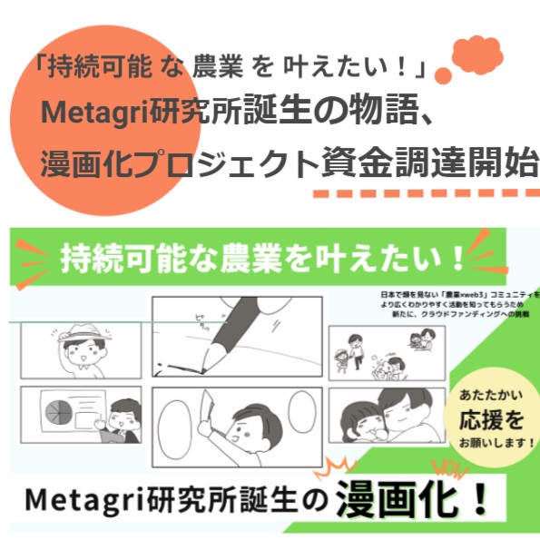 Metagri研究所の2年間の軌跡を描く漫画プロジェクトが始動。NFTとDiscordのコミュニティ活動から生まれたこの取り組みは、目標額20万円で、漫画制作・印刷・配送・特典NFT発行の資金としています。サポートコースも用意し、特にプラチナサポートでは感謝の4コマ漫画も!皆様のご支援で、Metagri研究所の物語を広め、コミュニティをさらに豊かにしましょう!