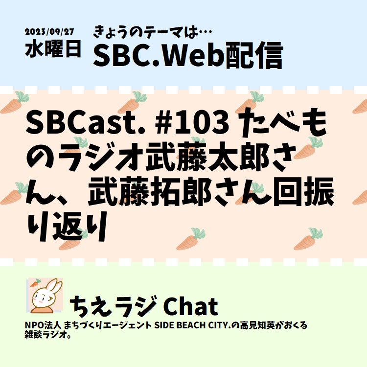 先日放送したSBCast. #103 たべものラジオ武藤太郎さん、武藤拓郎さんにお越し頂いた回の振り返りをしました。 #ポッドキャスト #ちえラジSBC.Web配信 * SBCast.#103 身近な食べ物から社会を覗いてみる(たべものラジオ 武藤太郎さん、武藤拓郎さん) | まちづくりエージェント SIDE BEACH CITY.
