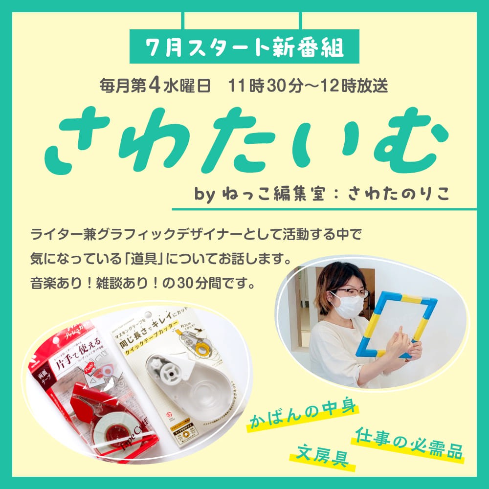 グラフィックデザイナー、ライターとして大館で活躍している「さわたのりこ」さんの、オリジナルトーク番組です。 「さわたいむ」 ラジオコンセプトは、刺さる人には刺さる、興味のない人はほんとどうでもいい番組❤ 逆に興味深々ですよね! 文房具好きさん、 フリーで働く皆さん、 デザインや文章のお仕事に関心のある皆さん、 是非お聴きください♪ 第4水曜日 午前11時30分(生放送)