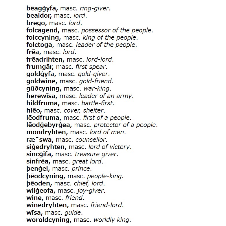hellog 「#2677. Beowulf にみられる「王」を表わす数々の類義語」を参照. http://user.keio.ac.jp/~rhotta/hellog/2016-08-25-1.html