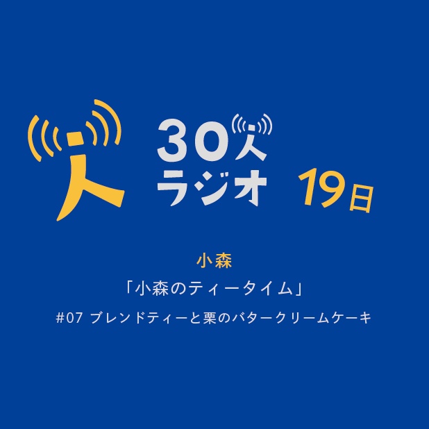 「小森のティータイム」 第七回 ブレンドティーと栗のバタークリームケーキ パーソナリティ:小森 ブレンドティーと栗のバタークリームケーキをいただきます。 30人で更新する架空のラジオ局「30人ラジオ」の毎月19日を担当しています。 30人ラジオとは・・・ 「30人集まればもっと文殊の知恵」ということで30人を集めてひとり一日のラジオを担当すれば、毎日更新されるラジオ局になるんでは! というアイデアから始まったチャンネルです。