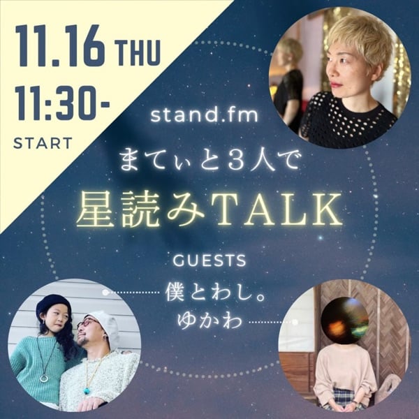 本日11/16(木)11:30〜 星読みトークコラボライブ💫 を行います! まてぃさんとゆかわ氏と3人です😁 https://stand.fm/channels/5f52cbbe6a9e5b17f7bc7df6 ⭐️ライブはまてぃさんのとこ⭐️ ものすごく楽しみライブなので、お暇なら来てよね😊 #星読み #コラボライブ #はじめまして #よろしければどうぞ