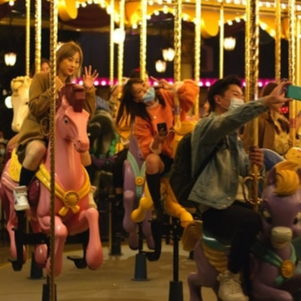 カップルは春の遊園地でメリーゴーランドに乗る