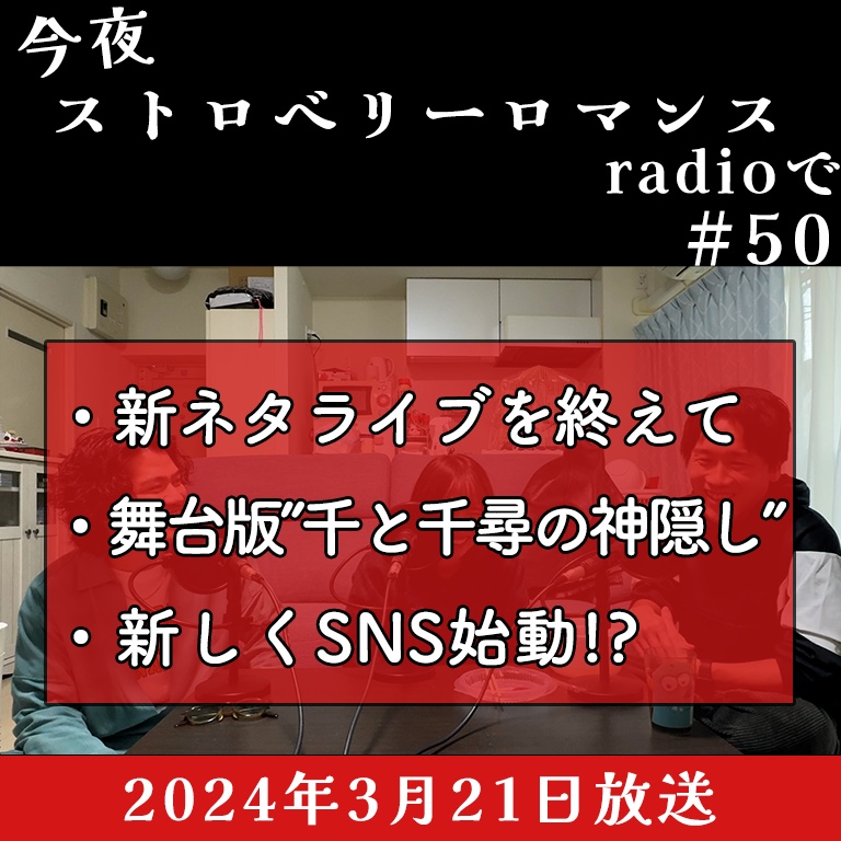 新ネタライブ直後の放送ということもあり、新ネタライブの感想やクラチが行った舞台"千と千尋の神隠し"の話など、盛りだくさんの回となっております!