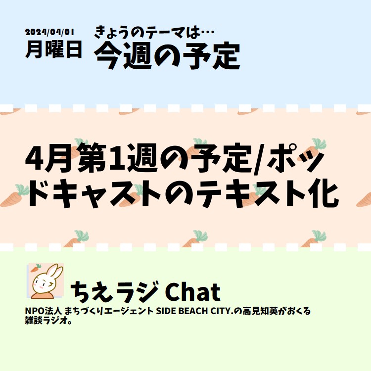 4月第1週の予定とポッドキャストのテキスト化についての話をしました。 #ポッドキャスト #オンラインイベント #声日記 #ちえラジ今週の予定