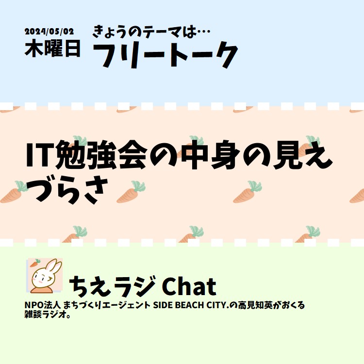現在毎日電話に開催されているIT勉強会でもその中身って案外見えづらくなっていないかなという話をしました。 #IT勉強会 #声日記 #ちえラジフリートーク - connpass - エンジニアをつなぐIT勉強会支援プラットフォーム
