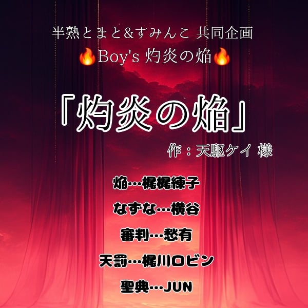 半熟とまと&すみんこ共同企画🔥Boy's 灼炎の焔*第三回* ✼•┈┈┈┈•✼ 13:19~ 配役&CASTさん紹介 18:42~ 本編「灼炎の焔」 01:06:50~ アフタートーク ✼•┈┈┈┈•✼ 《使用台本/作者》 「灼炎の焔」作:天駆ケイ様 https://taltal3014.lsv.jp/api-server/public/share/script/246 《配役/CAST(敬称略)》 焔…梶梶練子 薺…横谷(よこや) 審判…愁有 天罰…梶川ロビン 聖典…JUN ✼•┈┈┈┈•✼