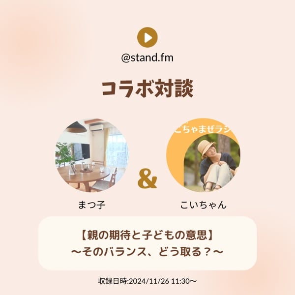 まつ子の整え実験室のまつ子さんと、子育てについてざっくばらんにお話させて頂きました😊 親の期待と目の前にいる子どもの意思…匙加減の難しいテーマでしたが、終始楽しい収録でした🫶✨ ご感想などもお待ちしております🙌💓 お相手のまつ子さんのチャンネルはこちら⇩ https://stand.fm/channels/6389cded82838c6aa36de0bc #コラボ収録