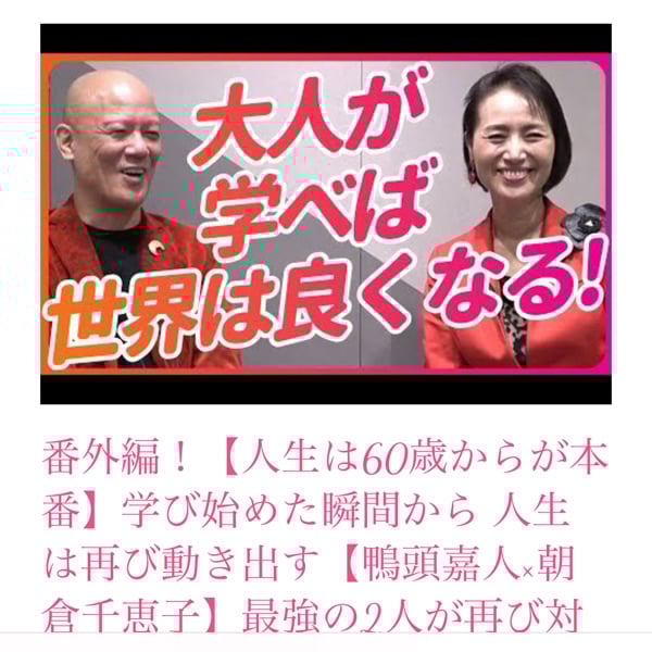 ✨鴨頭嘉人さん×朝倉千恵子先生 「大人が学べば世界は良くなる」 対談動画はこちら https://youtu.be/G8FAbLqV9io?si=CMqJpQDSnfsJs_qa ✨上記対談の文字起こし by べっくさん https://shinkikaitaku.blogspot.com/2024/12/60-2.html?m=1 べっくさん✨いつもありがとうございます😊 #鴨頭嘉人 さん #朝倉千恵子先生 #大人の学び #読書の大切さ #いつも聞いていただきありがとうございます