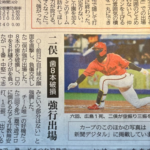 広島東洋カープの選手、二俣(ふたまた)さんが自打球で歯を8本折りました。 しかし、次の日の試合に強行出場。黒マスクを着用し、目だけ出して全力でプレーしています。 そこから、色々思って話しました。 プロスポーツって、ブラックじゃないでしょうか? サムネイルは4日の中国新聞です。 #広島東洋カープ #二俣翔一 #野球 #看護婦