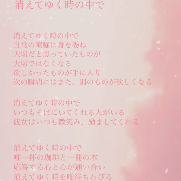 皆さま、如何お過ごしでしょうか? 今回は「消えゆく時の中で」を山ガールzさんとコラボ収録致しました🎙️ 先日、即興で書いた詩になります✍️ 消えてゆく時の中で 消えてゆく時の中で 日常の喧騒に身を委ね 大切だと思っていたものが 大切ではなくなる 欲しかったものが手に入り 次の瞬間にはまた、別のものが欲しくなる 消えてゆく時の中で いつもそばにいてくれる人がいる 彼女はいつも微笑み、励ましてくれる 消えてゆく時の中で 唯一杯の珈琲と一冊の本 応答する心と心が通い合い 消えてゆく時を唯待ちわびる 聴いて下さり有難うございました🌟 みほ7さん番組URL⇩ https://stand.fm/channels/6009986c2b4a4592fe0dc27a ▼今週の応援番組📣 今回の音源もHearty sound boxさんの音源でBGMお届けして参ります🎵 是非、遊びに行ってみてください! 【Hearty soundさん番組URL】 https://stand.fm/channels/612888cd7de6f0a0e0b49f20 新番組 Hearty sound boxさん番組URL ☟ https://stand.fm/channels/652d8759bcd1491cab8ed9a9 Hearty sound さん note⇩ https://note.com/hearty_sound #読書感想 #朗読 #子育て #勉強法 #HeartysoundBox #毎日配信