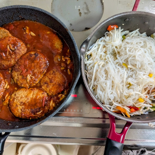 明日お休みを頂くので 2日分作り置きです。 本日の夜おかず トンテキ なんちゃってラーメン風 きゅうりとトマトのサラダ キャレットとモヤシと揚げの味噌汁 明日のおかず 朝 ウインナーキャベツ炒め、目玉焼き 昼 チャーハン 夜 ハンバーグデミグラスソースオニオンフライのせ 鮭ミンチカツ ポテサラ #寮メシ #寮母 #アスリートフードマイスター #高校野球
