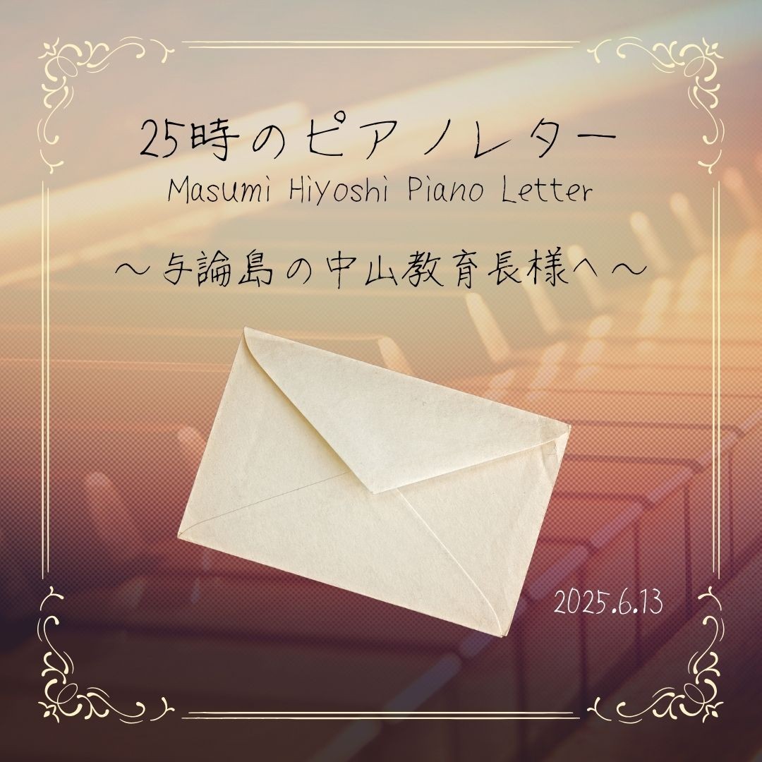 2025.6.13の深夜のピアノライヴにて 「25時のピアノレター」を即興。 与論島の教育長様、 私が送った我が故郷が誇る富士山のポストカードを デスクに飾ってくださってるとのこと、 大変感激です! ナビさんからのリクエストで 教育長様にピアノレター弾かせていただきました。 来年2月の与論島コンサート、とても楽しみです。
