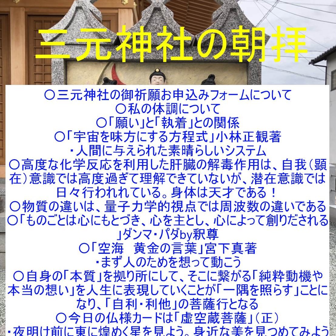 毎朝8時から、修祓、大祓詞、日供詞、龍神祝詞、般若心経、光明真言など)ご唱和出来る方はご一緒にご唱和ください。