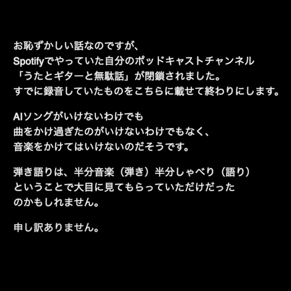SpotifyのPodcastは終わりますが、こちらの「弾き語り道」は続きます。閉鎖されたら終わりですが。