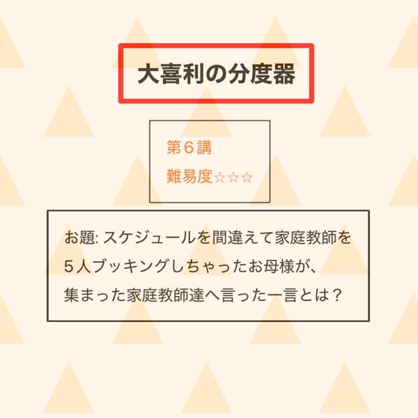 第6回お題: スケジュールを間違えて家庭教師を5人ブッキングしちゃったお母様が、集まった家庭教師達へ言った一言とは?