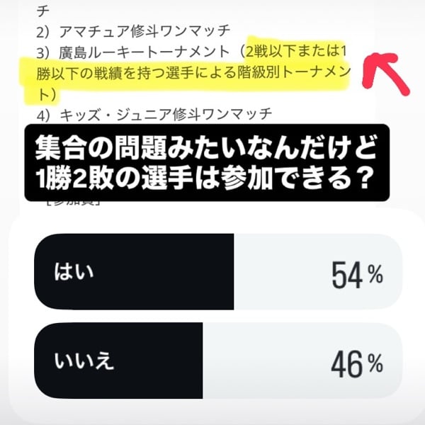 募集要項の文章力もそうですし、ルーキーカテゴリーの出場条件が大会によって異なるのは統合されると嬉しいですよね。 アンケート結果が五分になったのは、これまでの経験則で出れないと知っている方が「いいえ」に回答したのかもしれませんね。