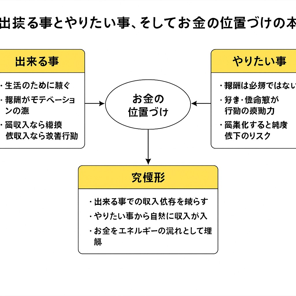 この理解を持つと、今の自分が「出来る事」をしているのか、「やりたい事」をしているのか、そしてそのお金との関係をどう設計すべきかが、はっきりと見えてきます。