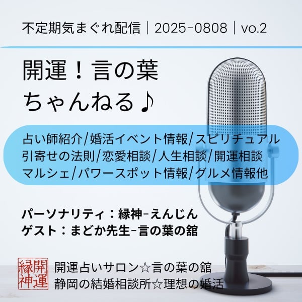 開運!言の葉ちゃんねる♪ 本日は第2回目の放送です。 ゲストは、言の葉の舘占い師 まどか先生です。 7月にデビューしたばかりの 期待の新人占い師さんです。 まどかさんの明るい笑い声が、 とっても素敵です♪ パーソナリティ https://shizuoka-uranai.com/enjin/ まどか先生 https://shizuoka-uranai.com/madoka/
