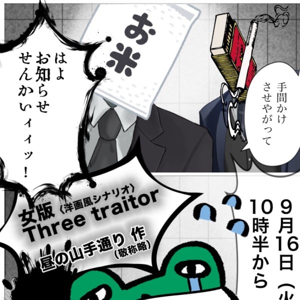 本編開始 『女版 Three traitor〈洋画風シナリオ〉』 作者:昼の山手通り(敬称略) ※投稿はシロヤギ(敬称略)名義で代理投稿
