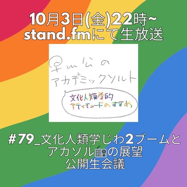 📢10/3(金)22時~生放送📢 第79回『文化人類学じわ2ブームとアカソル📻の展望 公開生会議』遂に文化人類学がブームに…!?5年前から予測していた私達アカソル📻️の今後の構想はどうなる!?リスナーの皆様のアイデアも聞かせて欲しいケロ🐸! ▼視聴/アーカイブ https://stand.fm/channels/5ff3ba011f63b1cf6894827t