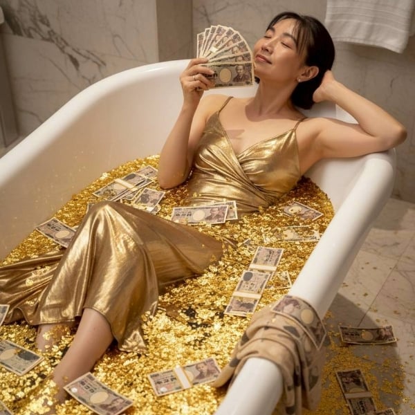 札束金粉風呂に実際入ると、あれれ〜?ってなりますよね! Nano Bananaおもしろい! はぴこさんちが火事にならなくて良かったです〜✨
