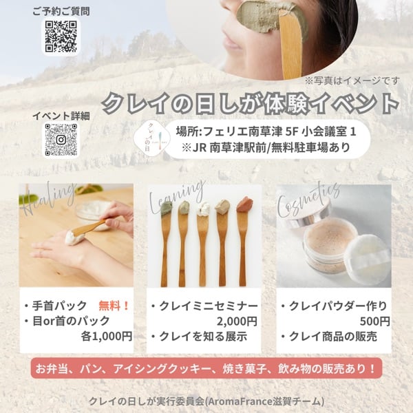 全国で初めて開催される『クレイの日』 滋賀会場の運営を担当しています! クレイパック無料体験やミニセミナー、コスメWS、 ナチュラルでかわいい食べものもたくさん集まります♪ 京都や大阪からのアクセスも良いので、 当日クレイや美味しいものを目指して、 クレイの日しがに遊びに来てください〜 #クレイ #クレイの日 #クレイパック #イベント #週末の過ごし方 #滋賀県 #草津 #美容 #セルフケア #セミナー