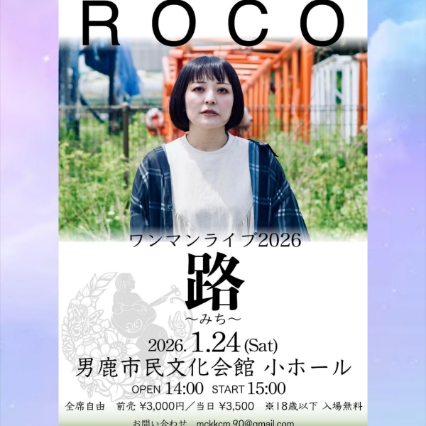 ROCO(ろこ) ワンマンライブ2026 路〜みち〜 2026.1.24(土) 秋田県男鹿市民文化会館小ホール OPEN 14:00 START 15:00 全席自由 前売3000円/当日3500円 ※18歳以下 入場無料 お問い合わせ mckkcm.90@gmail.com SOUに連絡を頂いてもお取り置き出来ます 皆様、応援よろしくお願いします
