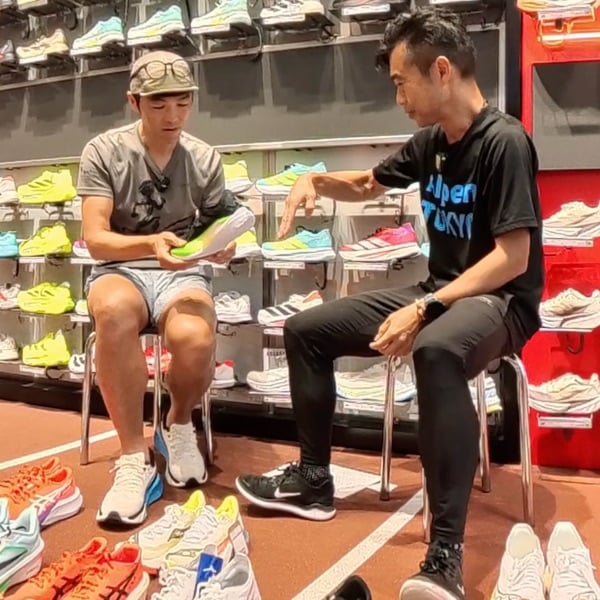 完走モデル、サブスリーモデル、サブフォーモデルごとにオススメシューズを説明してくれるAlpen東京スタッフの寺島さん(^^)