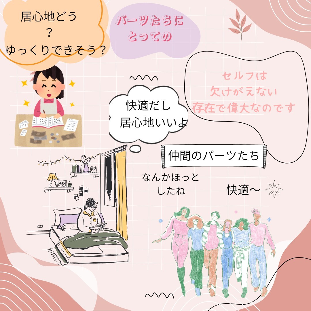 そんな、 パーツたちの間に和やかな空気を育てるために、 どんな言葉かけや寄り添いができるのかをお話ししています。 私自身のケースも交えながら、 実際にどんなふうに関わっているかをご紹介しています。