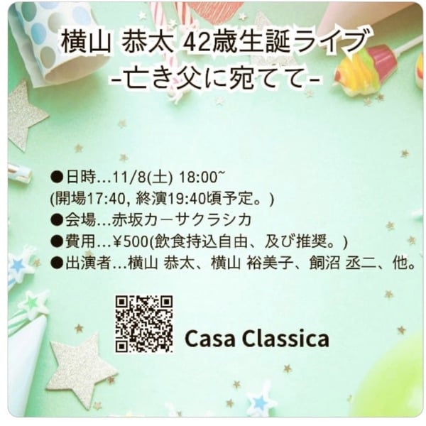 スタンドfmがご縁で、FM横山さんのギター初ライブが本日18時から開演です。お父様がお亡くなりなり、悲しみを乗り越えての追悼と、お父様と、ご自身のバースデーの意味もあるライブ赤坂で!お母様の演奏もあります。ジョージ先生のお弟子さんで、ギター、作曲もできる才能豊かな方です!