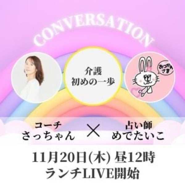 11月20日(木)お昼12時〜 私のチャンネルで、占い師めでたいこさんとコラボLIVEやります!! お題は「介護、初めの一歩」 みなさま、ぜひ遊びにきてくださーい🥰