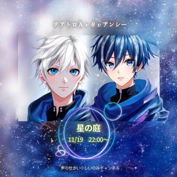 本日22:00からテアトロΆνθυアンシー11月公演 今回は、書き下ろし【星の庭】です 閉鎖された学園「星の庭」で、星を観測する少年ソラとカナタ。星の異常が迫る中、二人は互いを守る誓いを立てる。 星の庭で紡がれる、儚い物語 #テアトロΆνθυアンシー #声劇 #声優 #お耽美