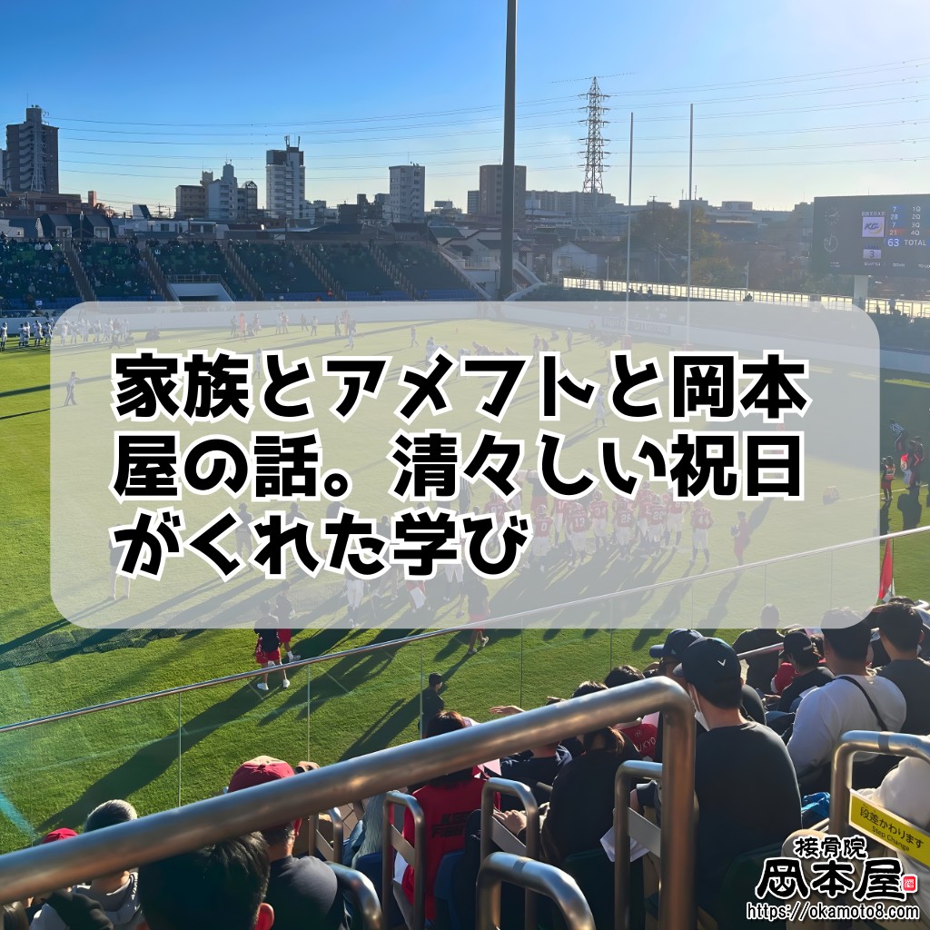 家族と過ごす時間って、忙しい毎日の中で 気づかないうちに心を整えてくれる存在ですよね 勤労感謝の日は、ふたごの娘とアメフト観戦へ スコア以上に胸が熱くなるシーンの連続で 48歳のオカモトも涙腺ゆるみそうになるほどの熱量…。🔥🏉 「勝ち負けだけじゃない」 あの瞬間に立ち会えたからこそ、 また明日から頑張れるエネルギーが湧いてきました。 家族、スポーツ、そして仕事。 全部つながって今の自分があるんだなぁと実感した祝日。 #岡本屋 #接骨院 #名古屋市南区 #勤労感謝の日 #スポーツの力
