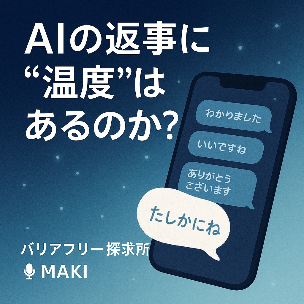 AIの 言葉は透けて 温度なく 余白にひそむ 人の温もり #視覚障害 #AI時代 #心の壁 #生成AI #iPhone #コミュニケーション #バリアフリー探求所 #バリ探 今日も楽しんで生きましょう! 今回も聴いてくださりありがとうございました。 疑問・質問・感想など、お気軽にお寄せください。